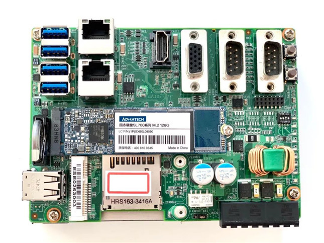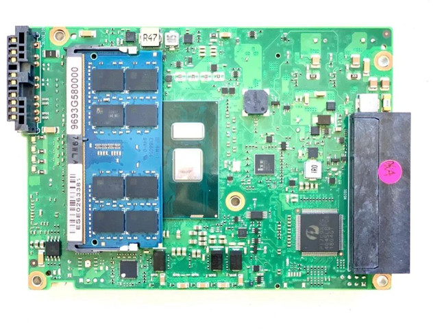 內(nèi)存的大小對于處理器性能有很大影響,畢竟各種數(shù)據(jù)都是要經(jīng)過內(nèi)存來送給計算機。在這塊電路板上搭載有兩個DDR4內(nèi)存卡槽,對稱的分布在電路板的兩面上。官方資料中說最大支持到32GB,也就是一個內(nèi)存卡槽最大支持16GB的內(nèi)存條。實測的這臺控制器上只插有一根8GB內(nèi)存條,但足以應(yīng)對小規(guī)模的應(yīng)用場合。