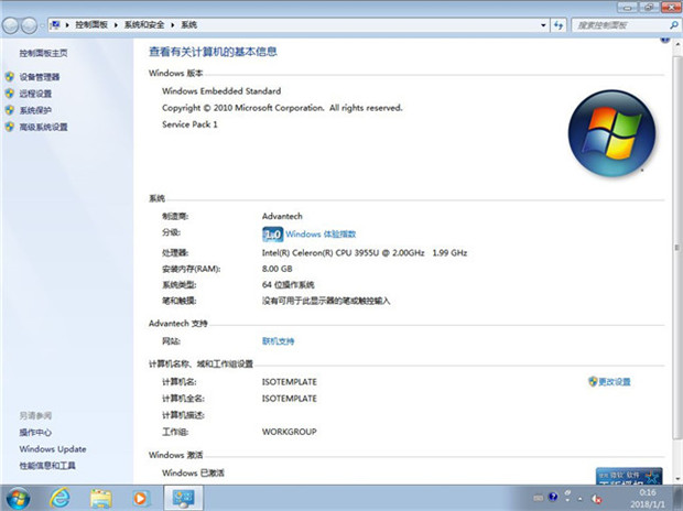 還是那個熟悉的Windows系統(tǒng)界面,在“我的電腦”的屬性中可以查看到這臺計算機的更多基本信息。界面顯示這臺計算機的制造商是Advantech(研華),安裝的是64位系統(tǒng),8G內(nèi)存,搭載英特爾賽揚3955U處理器,主頻是2.00GHz。